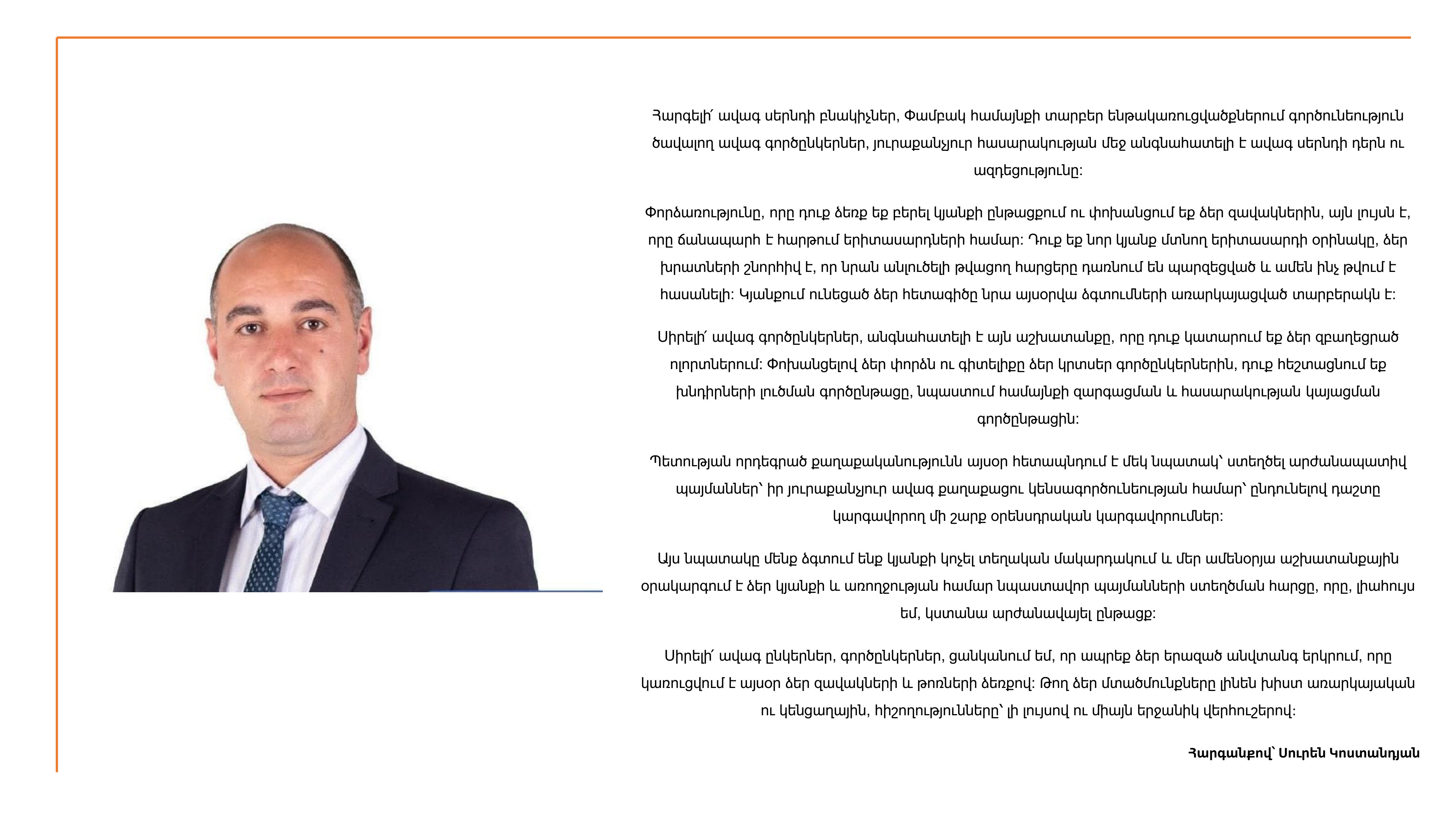 21/2025 | 12/08/2025 | Փամբակ համայնքի ղեկավար Սուրեն Կոստանդյանի ուղերձը՝ Երիտասարդների միջազգային օրվա կապակցությամբ | ՍՈՒՐԵՆ ԿՈՍՏԱՆԴՅԱՆ