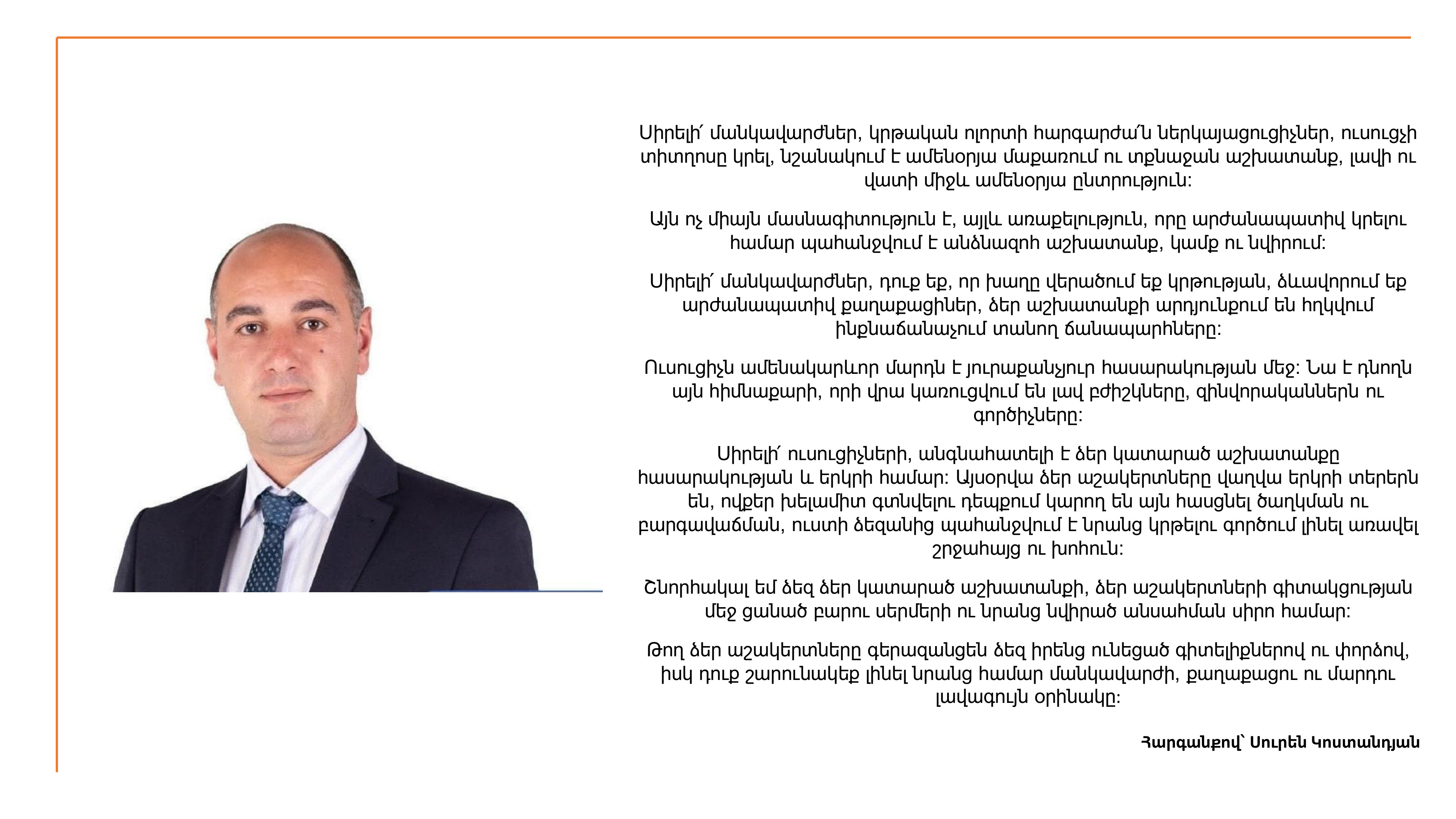 27/2025 | 05/10/2025 | Փամբակ համայնքի ղեկավար Սուրեն Կոստանդյանի ուղերձը՝ Ուսուցչի տոնի կապակցությամբ | ՍՈՒՐԵՆ ԿՈՍՏԱՆԴՅԱՆ