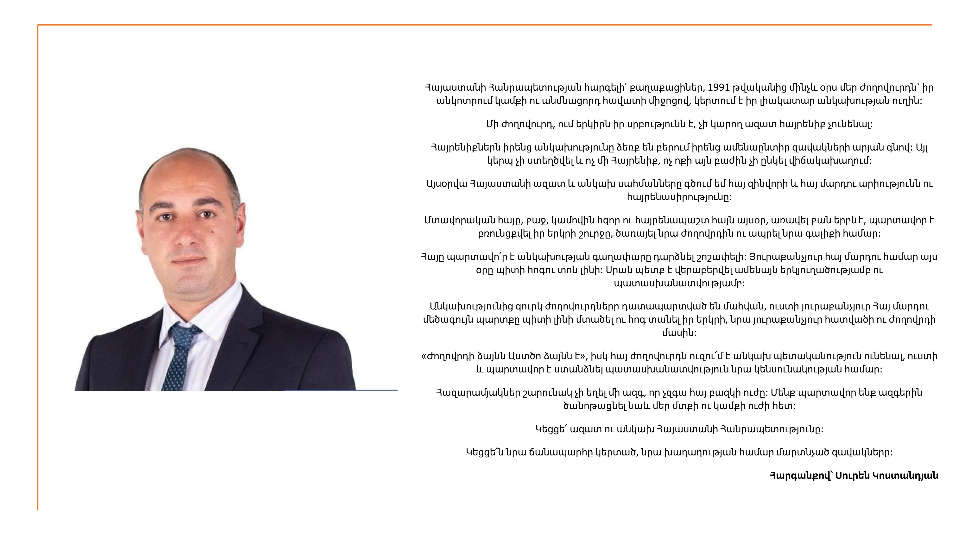 25/2025 | 21/09/2025 | Փամբակ համայնքի ղեկավար Սուրեն Կոստանդյանի ուղերձը՝ Հայաստանի Հանրապետության անկախության տոնի կապակցությամբ | ՍՈՒՐԵՆ ԿՈՍՏԱՆԴՅԱՆ